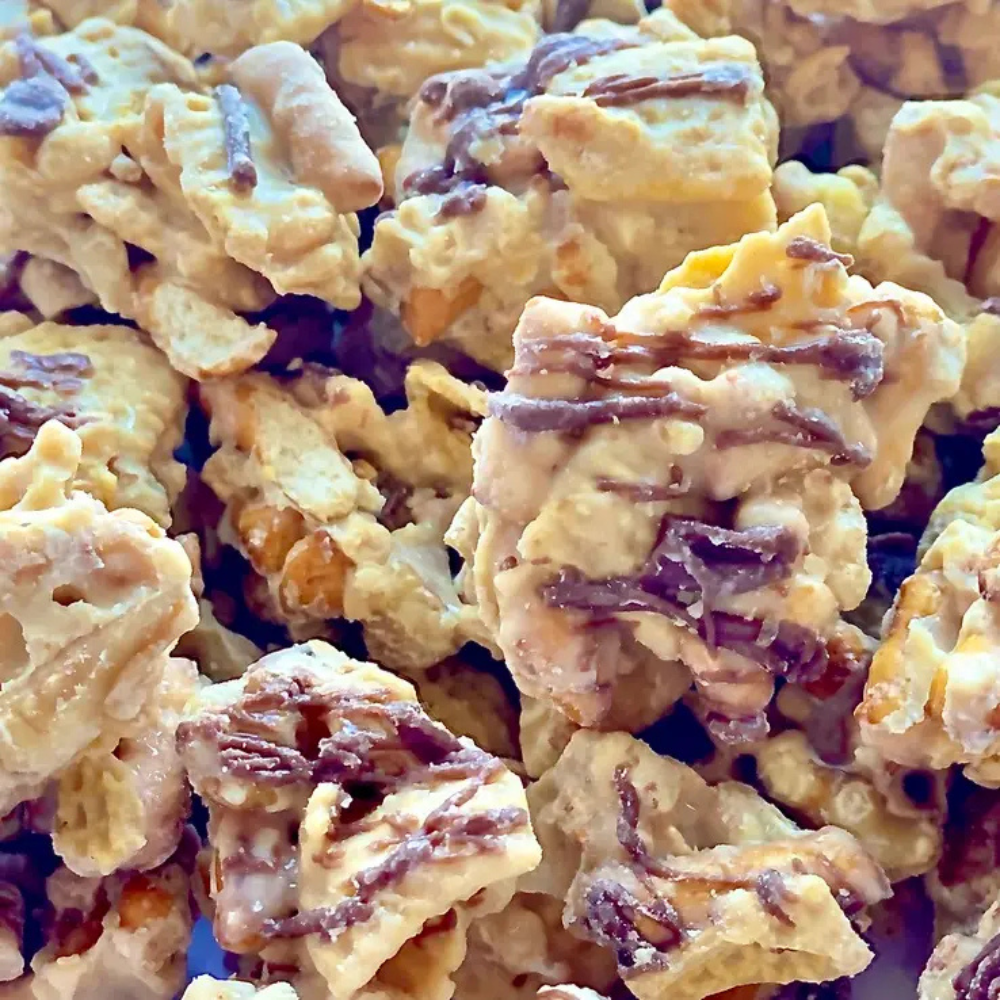 Treat yourself to the irresistible taste of our Peanut Butter Chocolate bite-sized clusters. A creamy peanut butter coating wraps crunchy pretzels, corn squares and savory peanuts, all topped with a decadent chocolate drizzle for the perfect blend of flavors.
